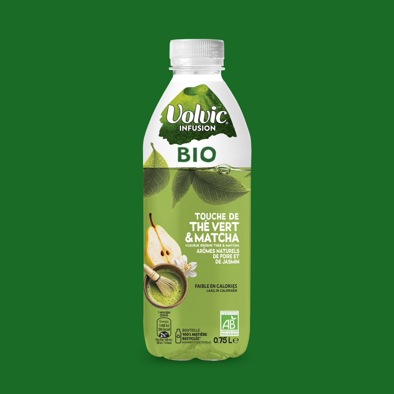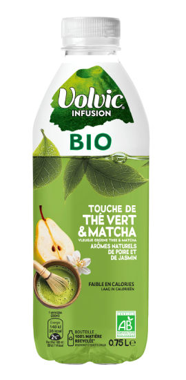 Ingrédients : Eau minérale naturelle volvic (95,2%), sucre de canne Bio (3,2%), jus de citron Bio à base de concentré (1,3%), infusion de thé vert Bio (0,1%), poudre de matcha bio (0,01%), arôme naturel de jasmin, arôme naturel de poire, antioxydant: acide ascorbique.